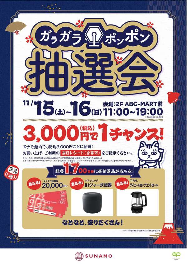 当日お買い上げレシート税込3,000円以上(合算可)で1回抽選に参加できます。