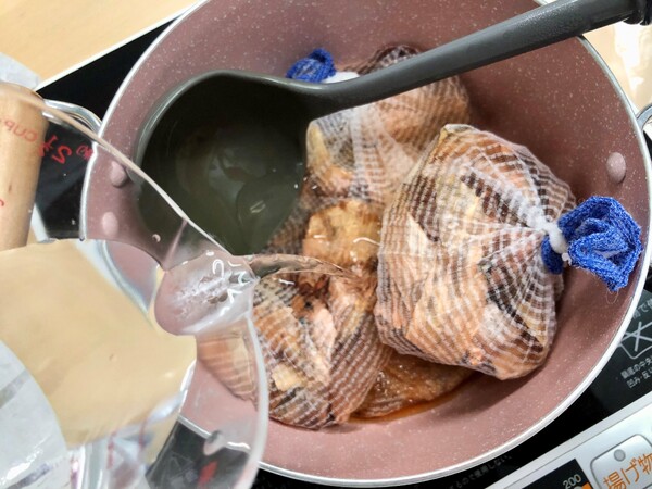 玉ねぎの皮をその場で煮だして染液を作り、ミョウバン媒染液で色を定着。