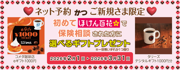 ネット予約かつご新規さま限定!初めてほけん百花で保険相談された方に 選べるデジタルギフトプレゼント!!